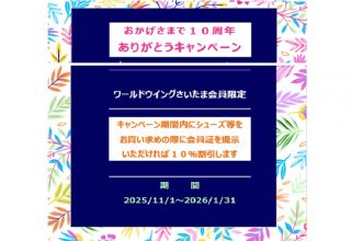 キャンペーン期間内に会員証を提示の上シューズ等商品をお買い求めいただければ10パーセント割引します。 なお、本キャンペーンはワールドウイングさいたま会員が対象です。 また、他の優待との併用は出来ません。