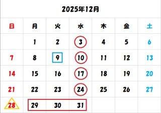 〇印:定休日、□印:各種届出締日、△印:短縮営業日(10時開館15時閉館)、□印:年末年始休業日(12/29-1/4)