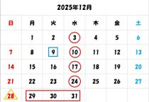 〇印:定休日、□印:各種届出締日、△印:短縮営業日(10時開館15時閉館)、□印:年末年始休業…続きを見る